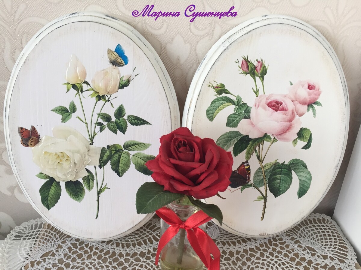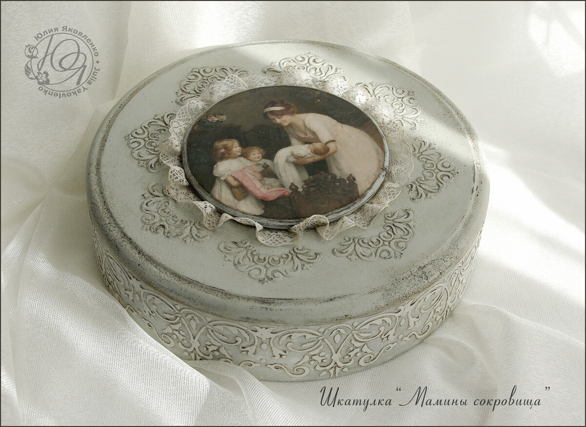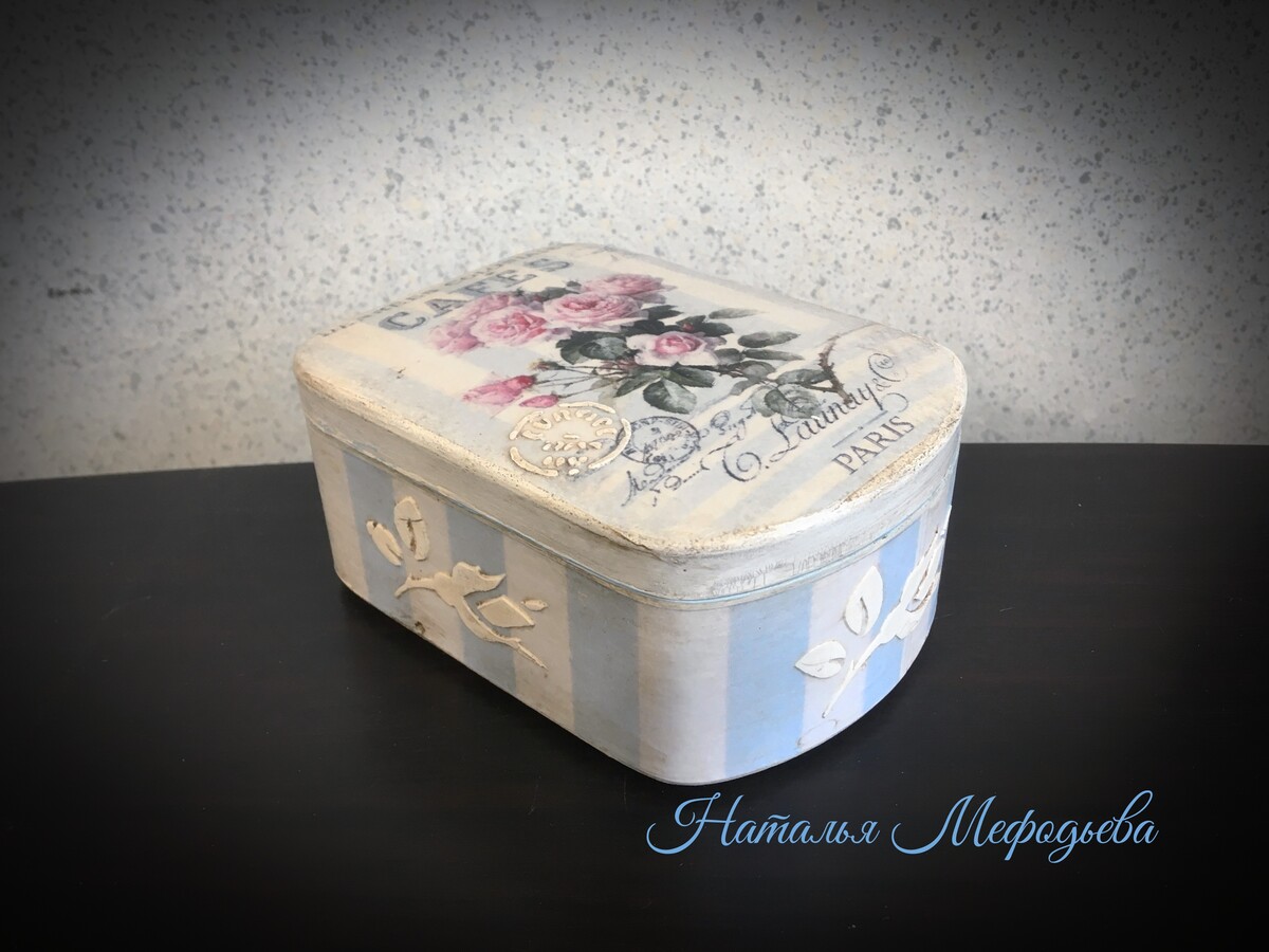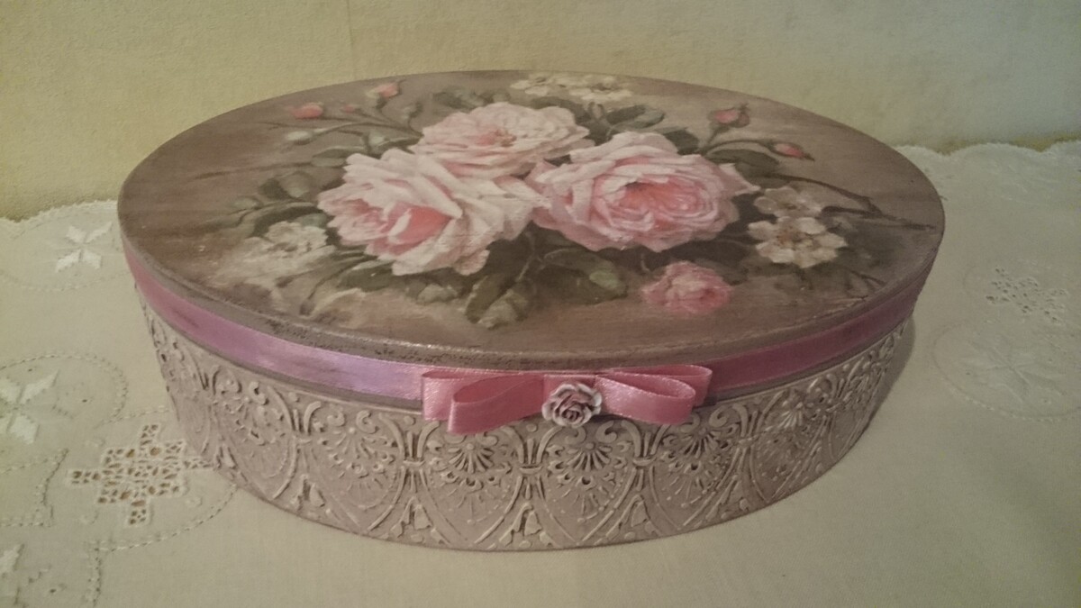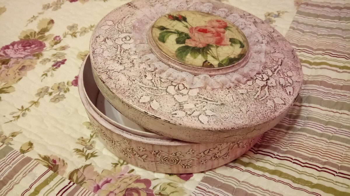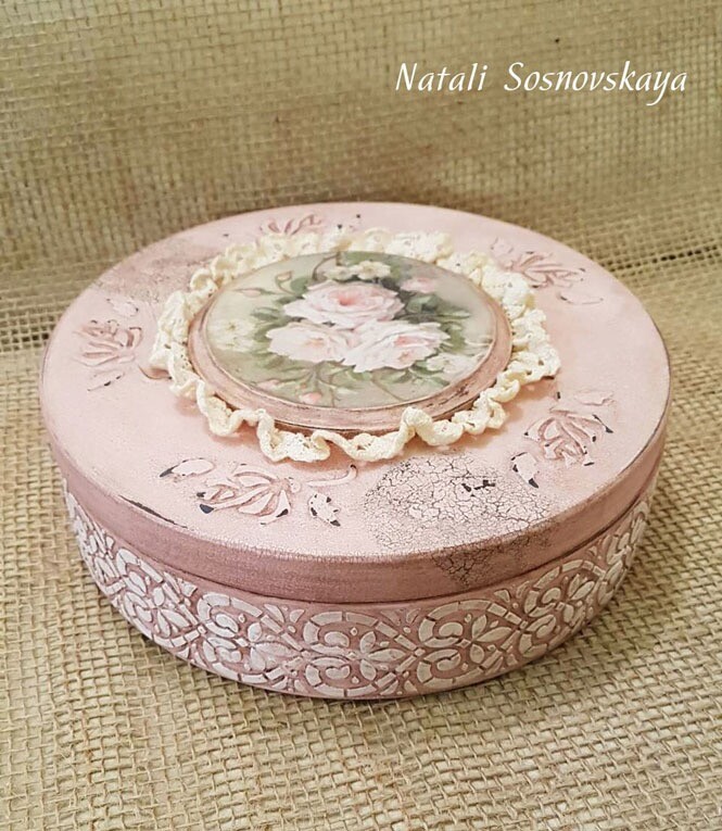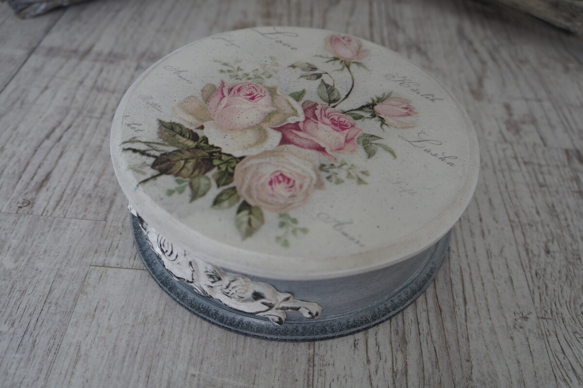 - декупаж не только на прямой поверхности, но и на боковинах круглой заготовки