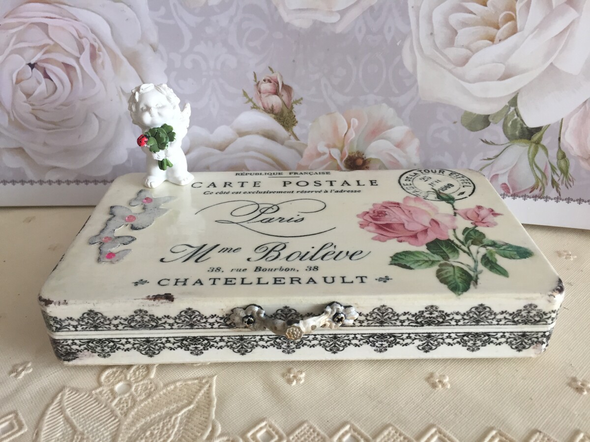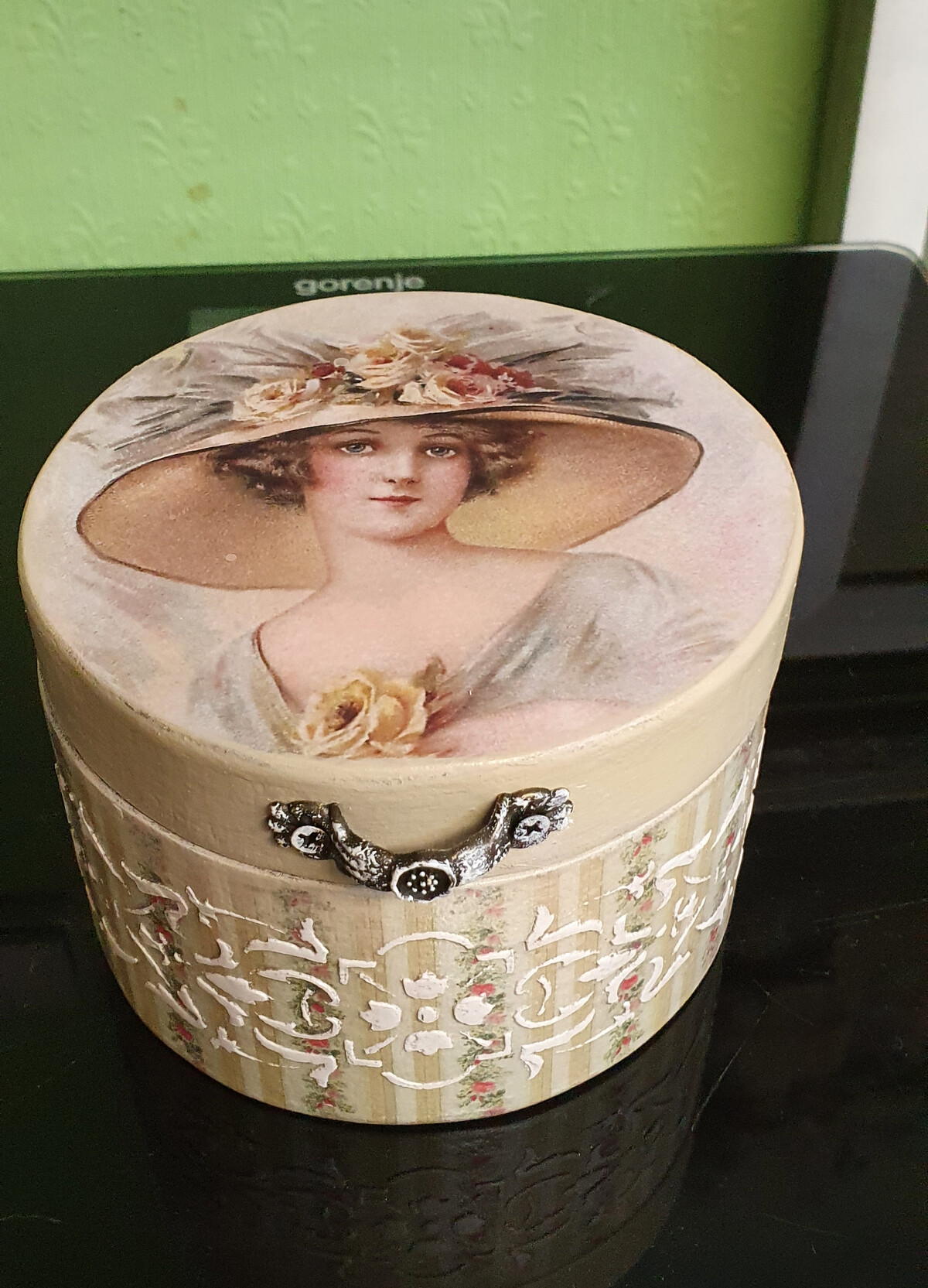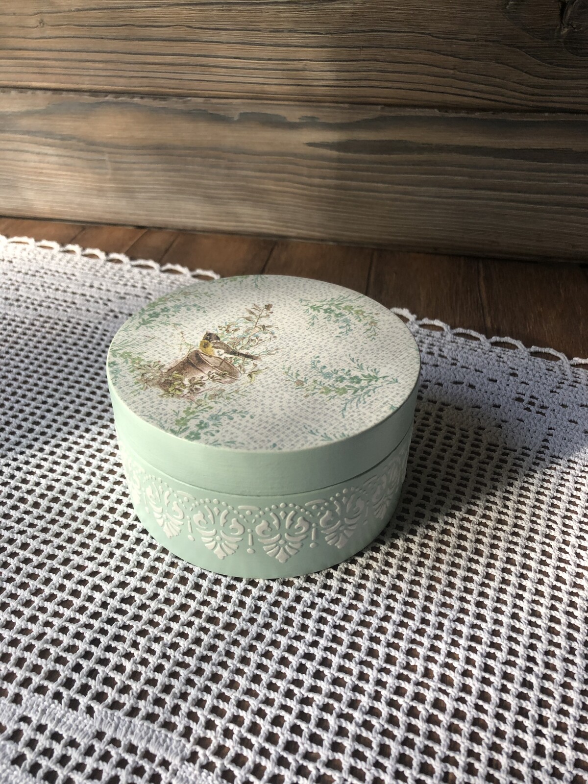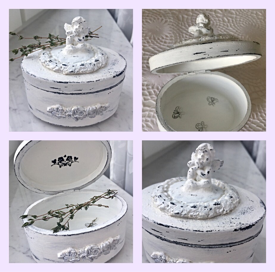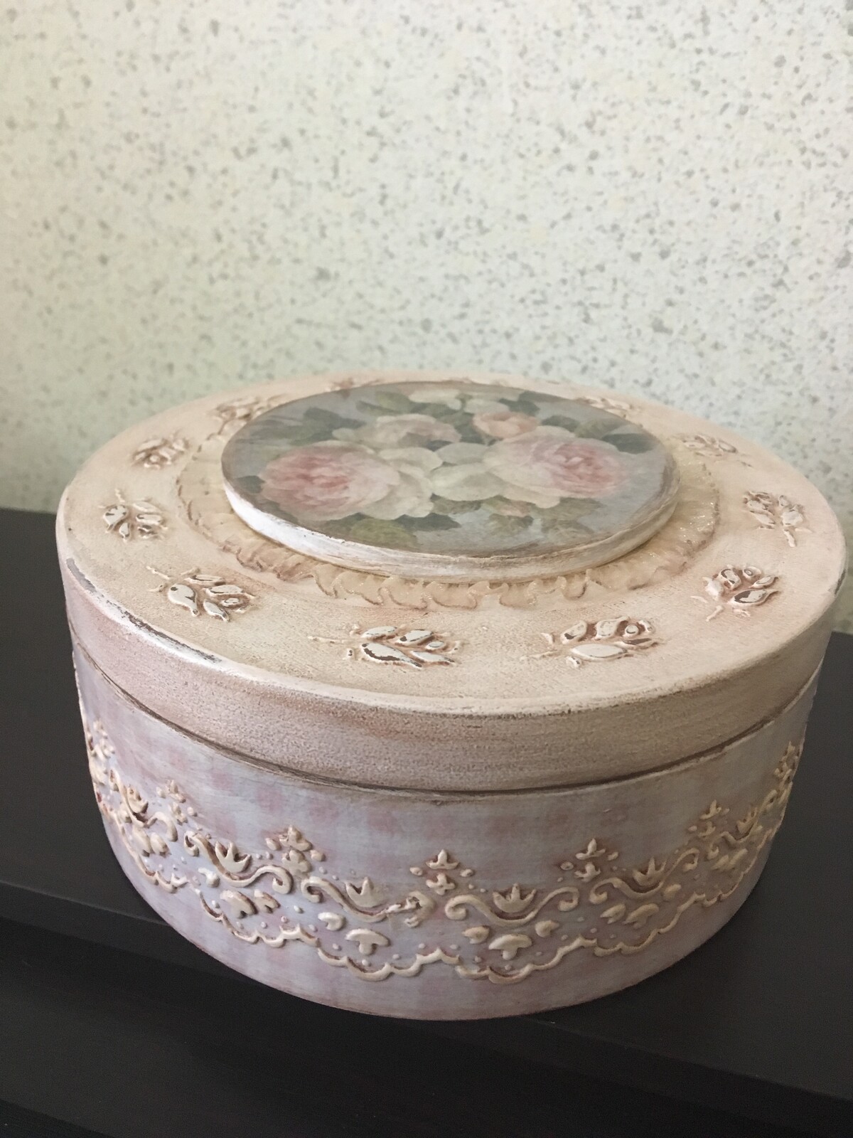 - декупаж не только на прямой поверхности, но и на боковинах круглой заготовки