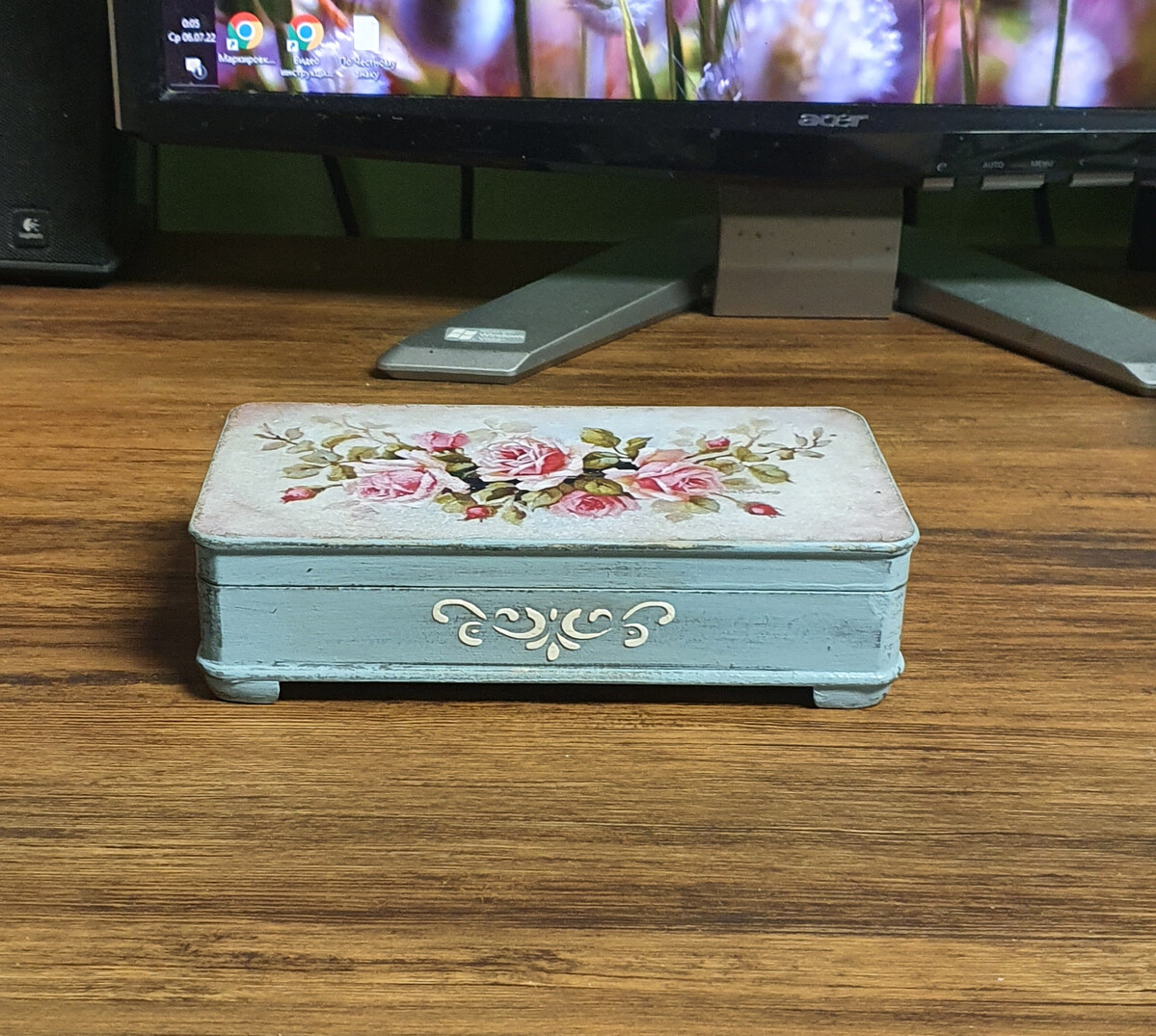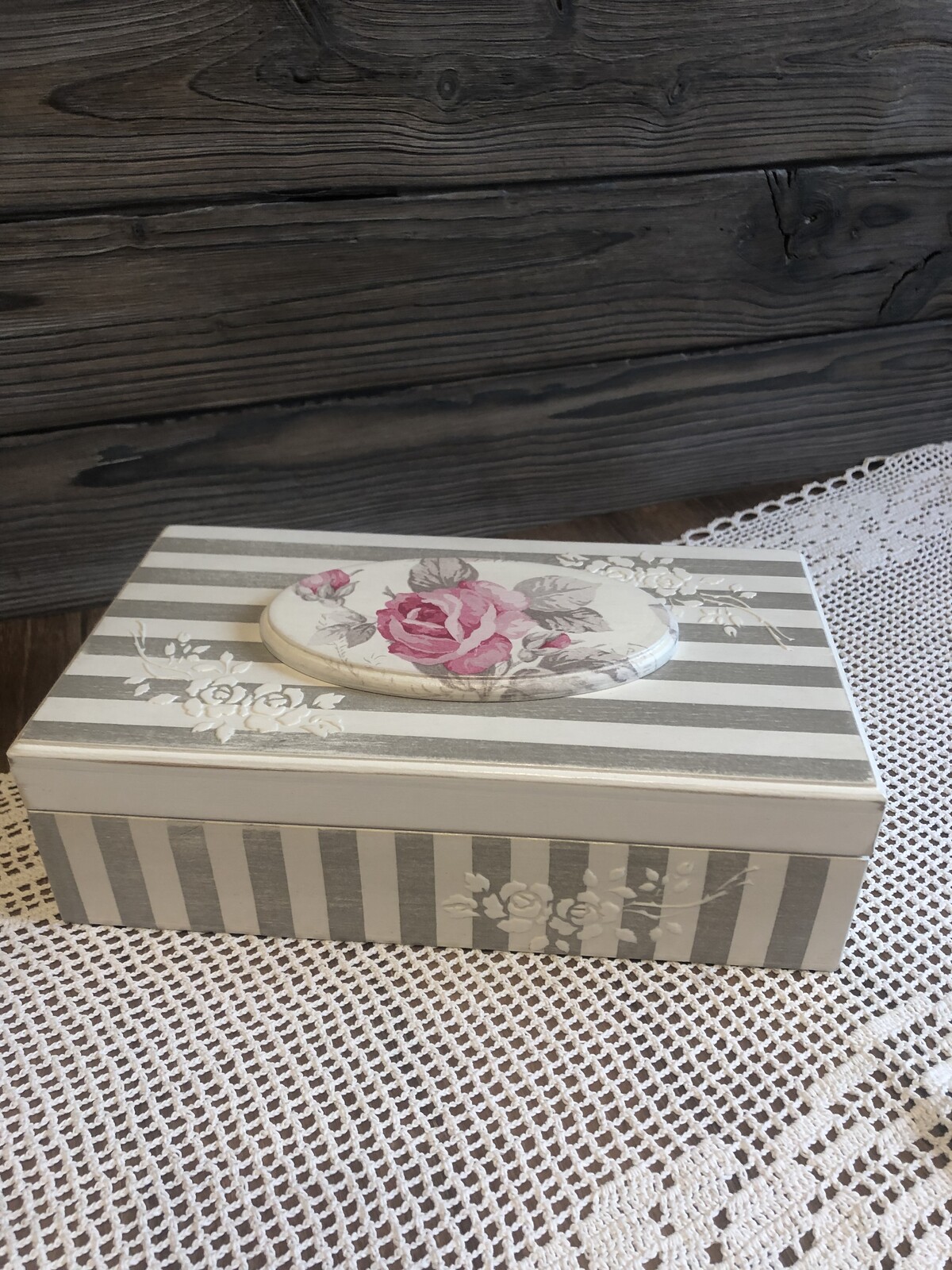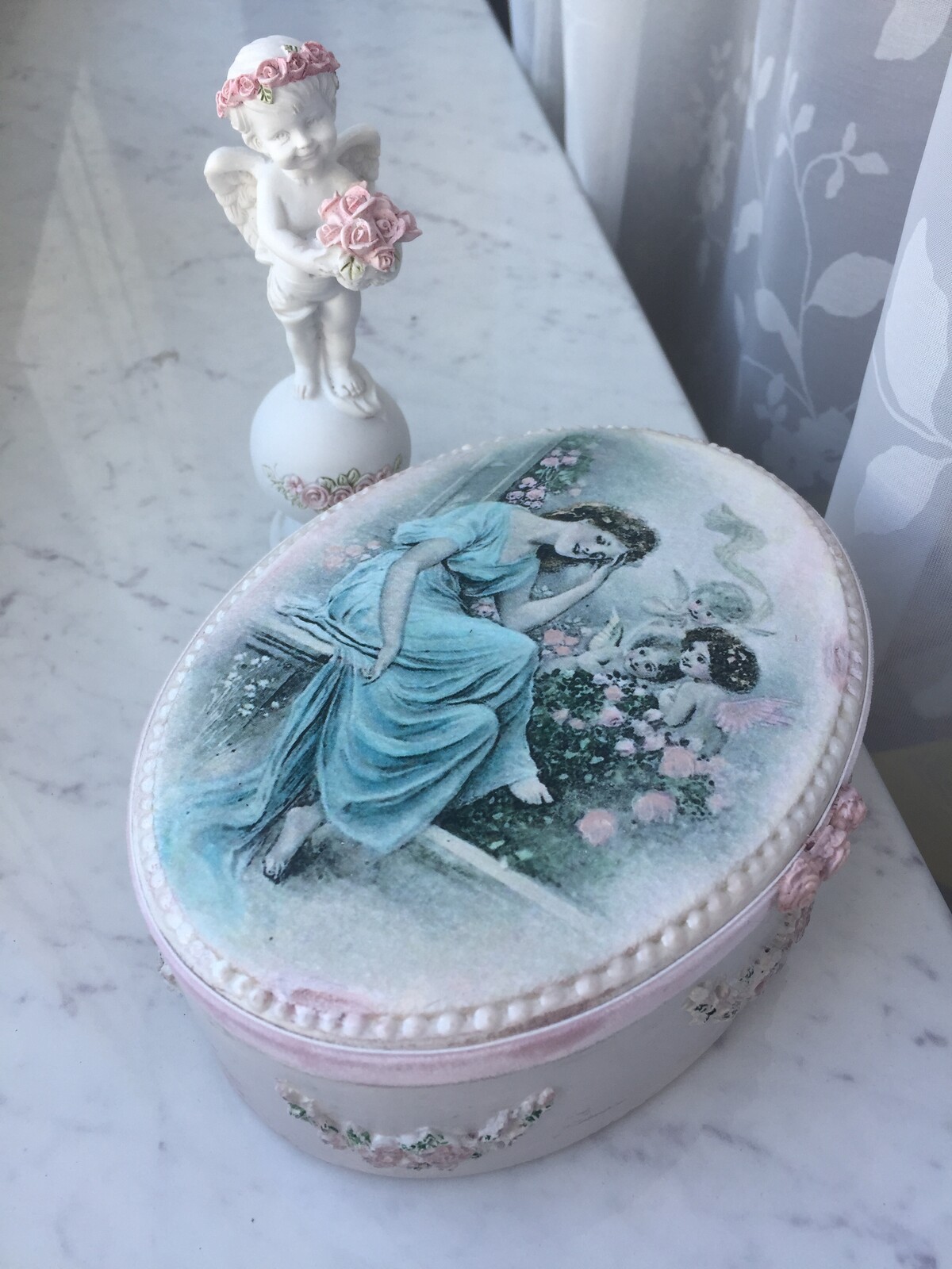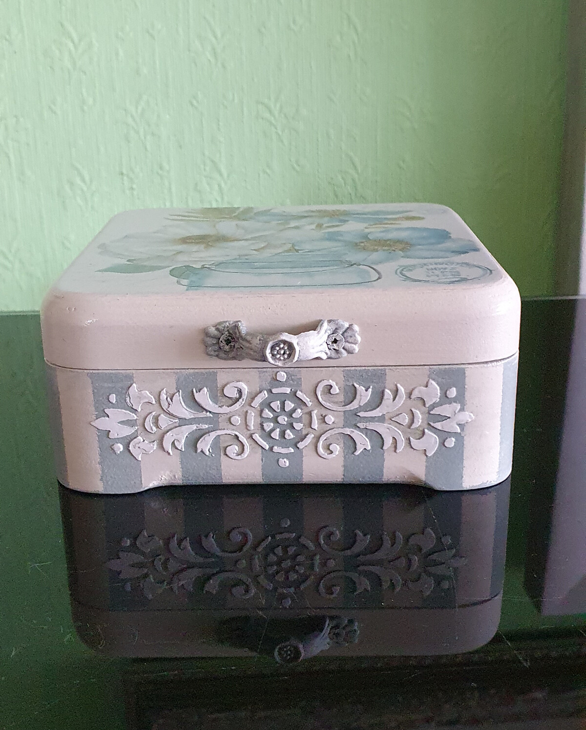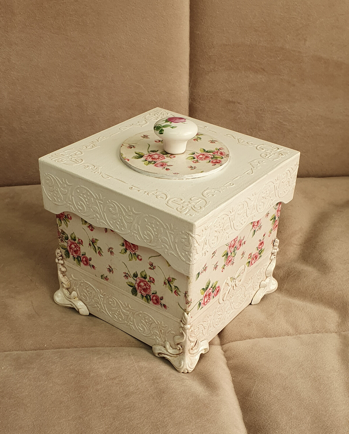 - декупаж не только на прямой поверхности, но и на боковинах круглой заготовки